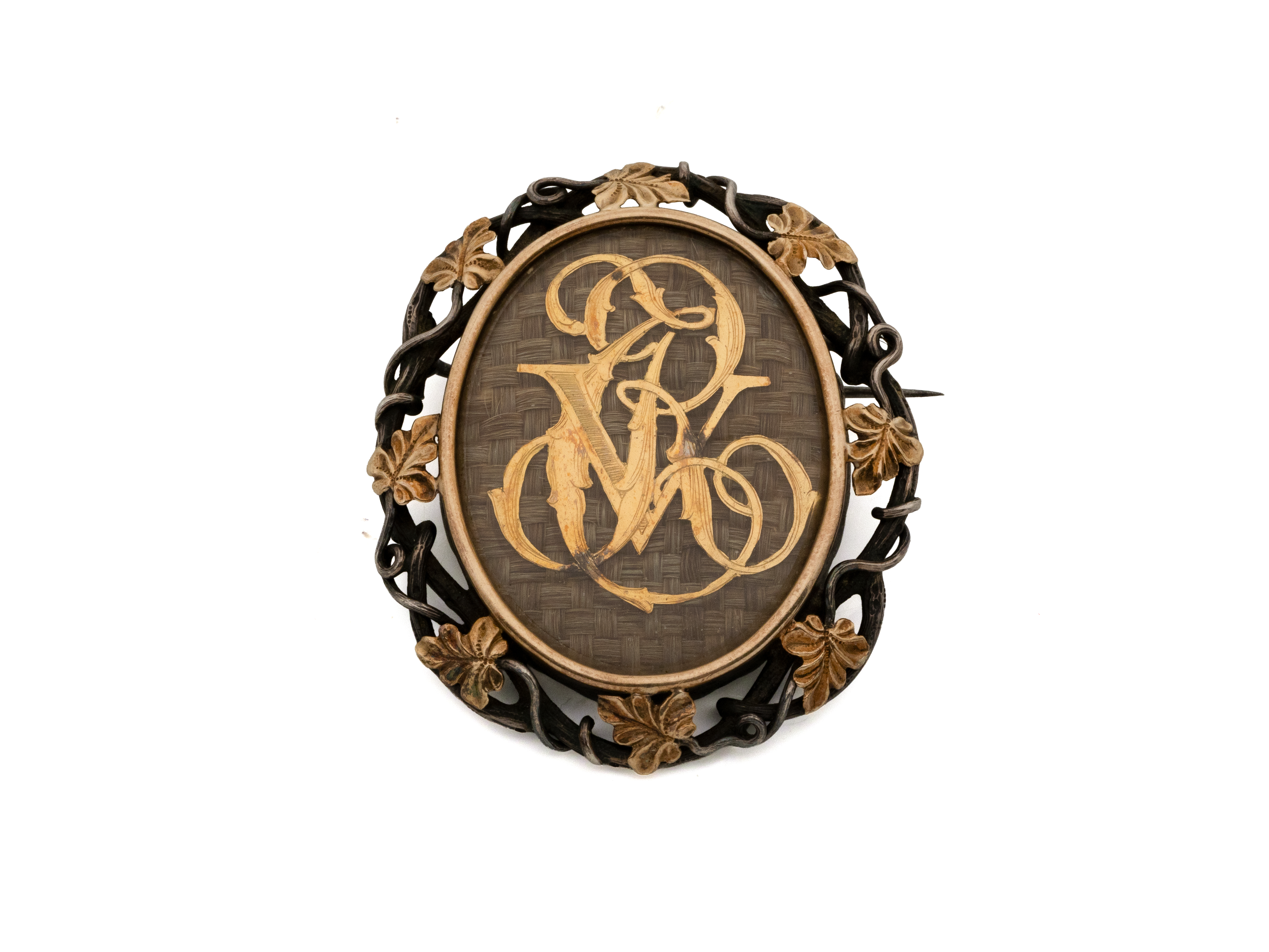 Lot n°28NV9188Broche devant de corsage en argent 800 millièmes partiellement vermeillé centrée d'un médaillon décoré d'une tresse de cheveux appliquée d'un monogramme. Dos nacré, l'épingle en métal. Travail français de la seconde moitié du XIX°siècle.