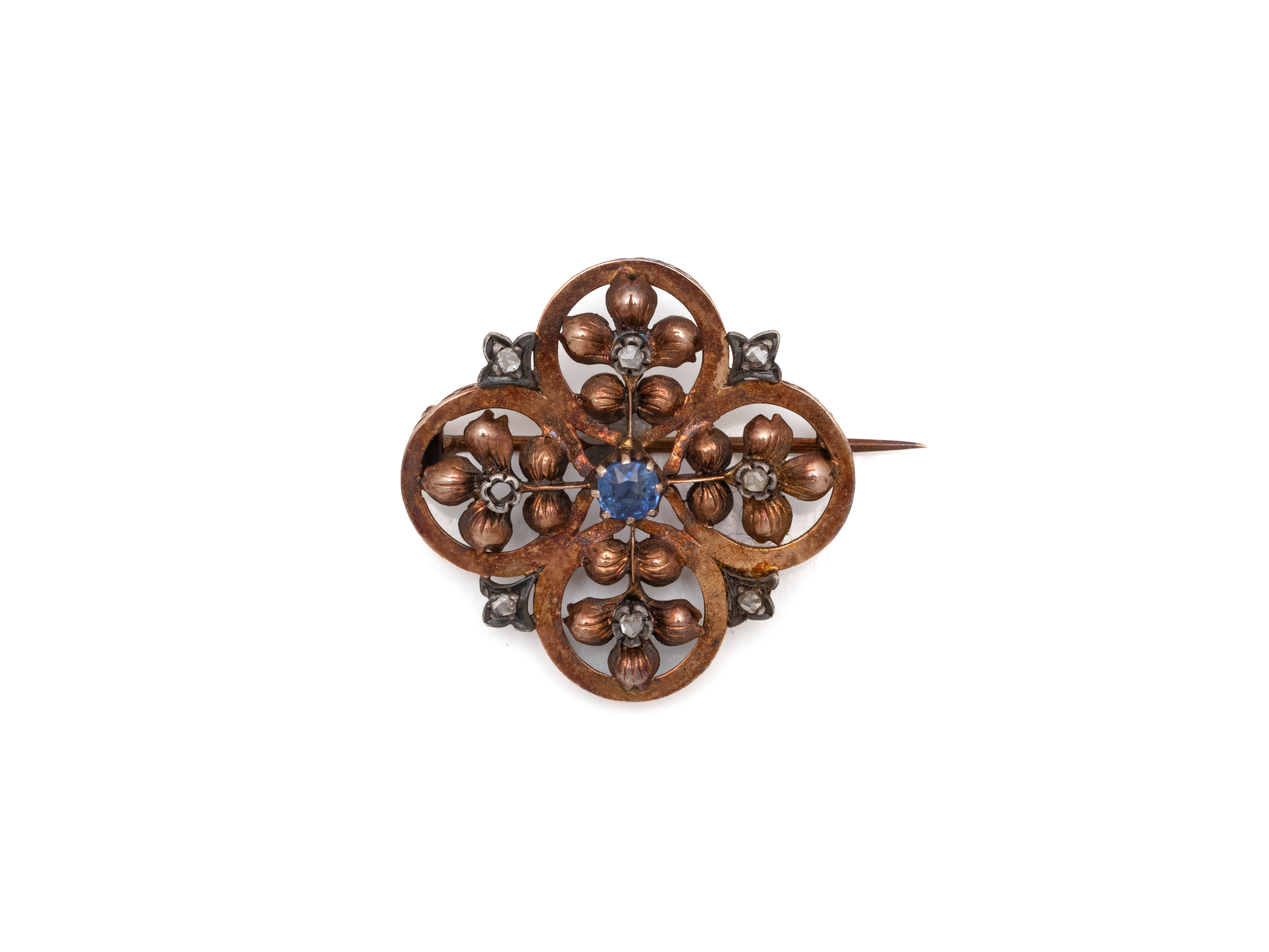 Lot n°36NV9192Broche en or 750 et argent 800 millièmes, de forme quadrilobée à décor feuillagé, centrée d'un petit saphir facetté, rehaussée de roses diamantées. L'épingle en or 585 millièmes. Travail français de la fin du XIX° siècle. (manque une rose)