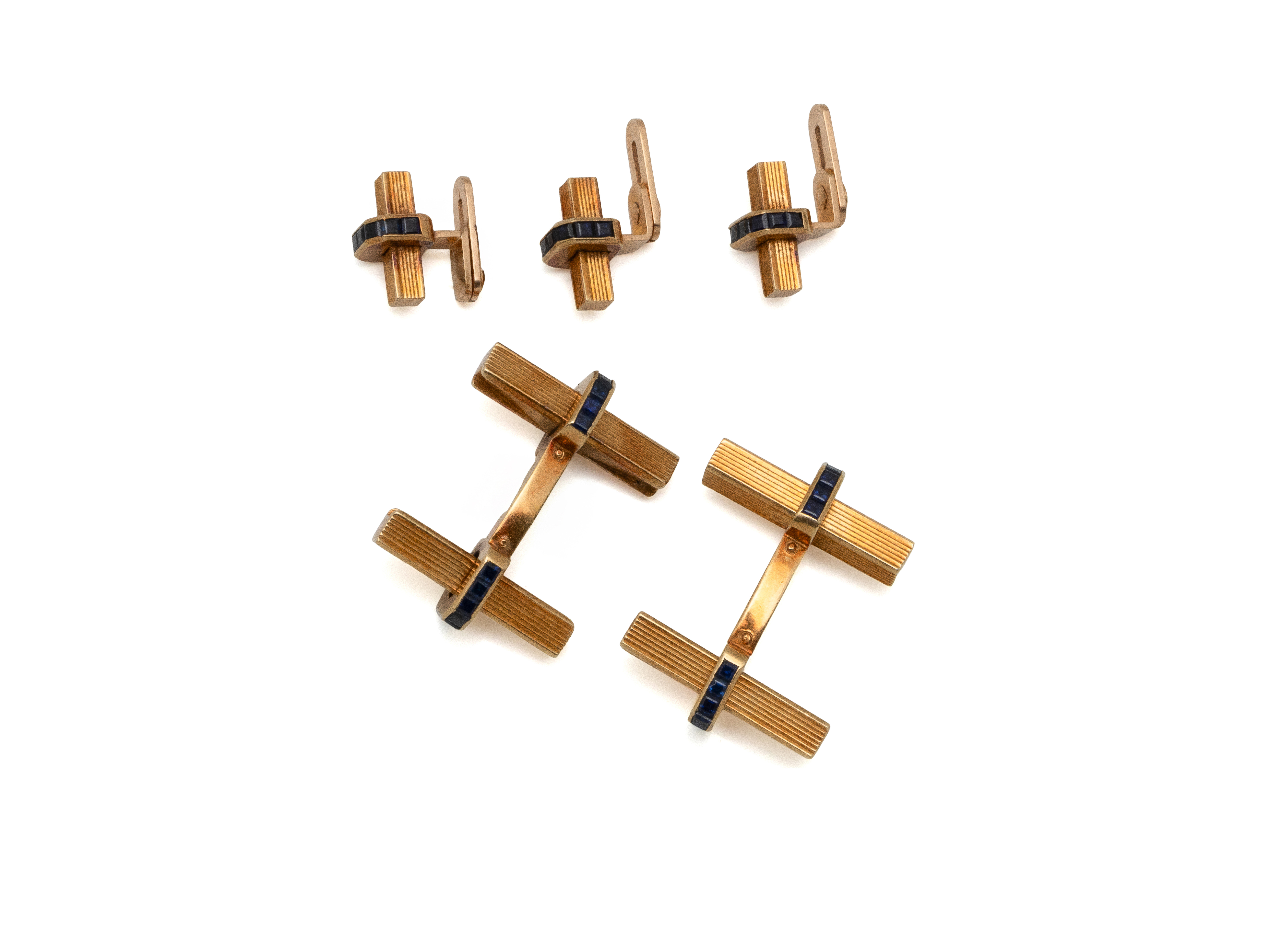 Lot n°52NV9201Élégant ensemble en or 750 millièmes, composé d'une paire de boutons de manchettes et de 3 boutons de col en or 750 millièmes, à décor rainuré, ornés de calibrés de saphirs en serti rail. Travail Français vers 1950.