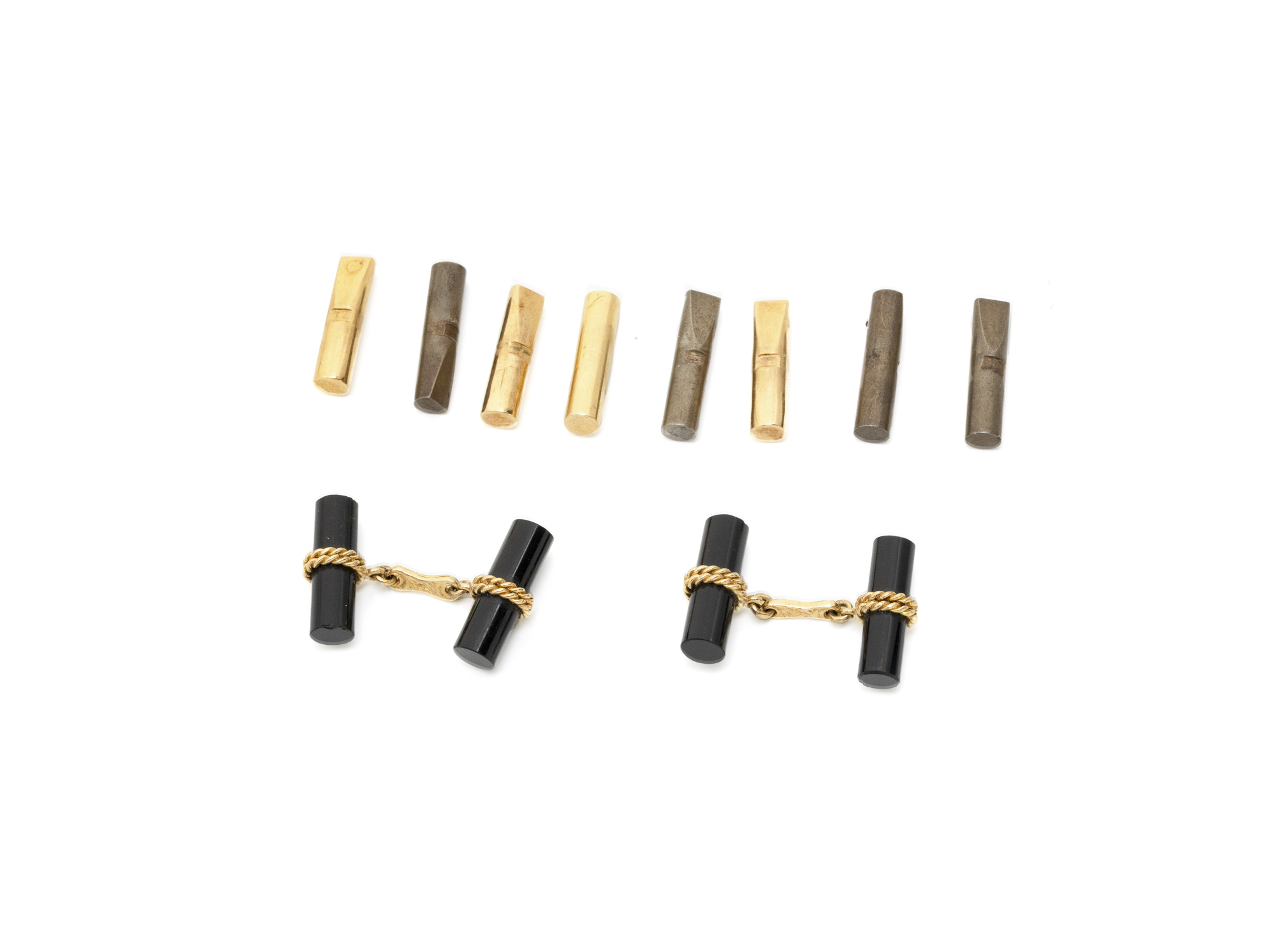 Lot n°50NV9131Ensemble en métal doré composé de 2 paires de boutons de manchettes et une pince à cravate.