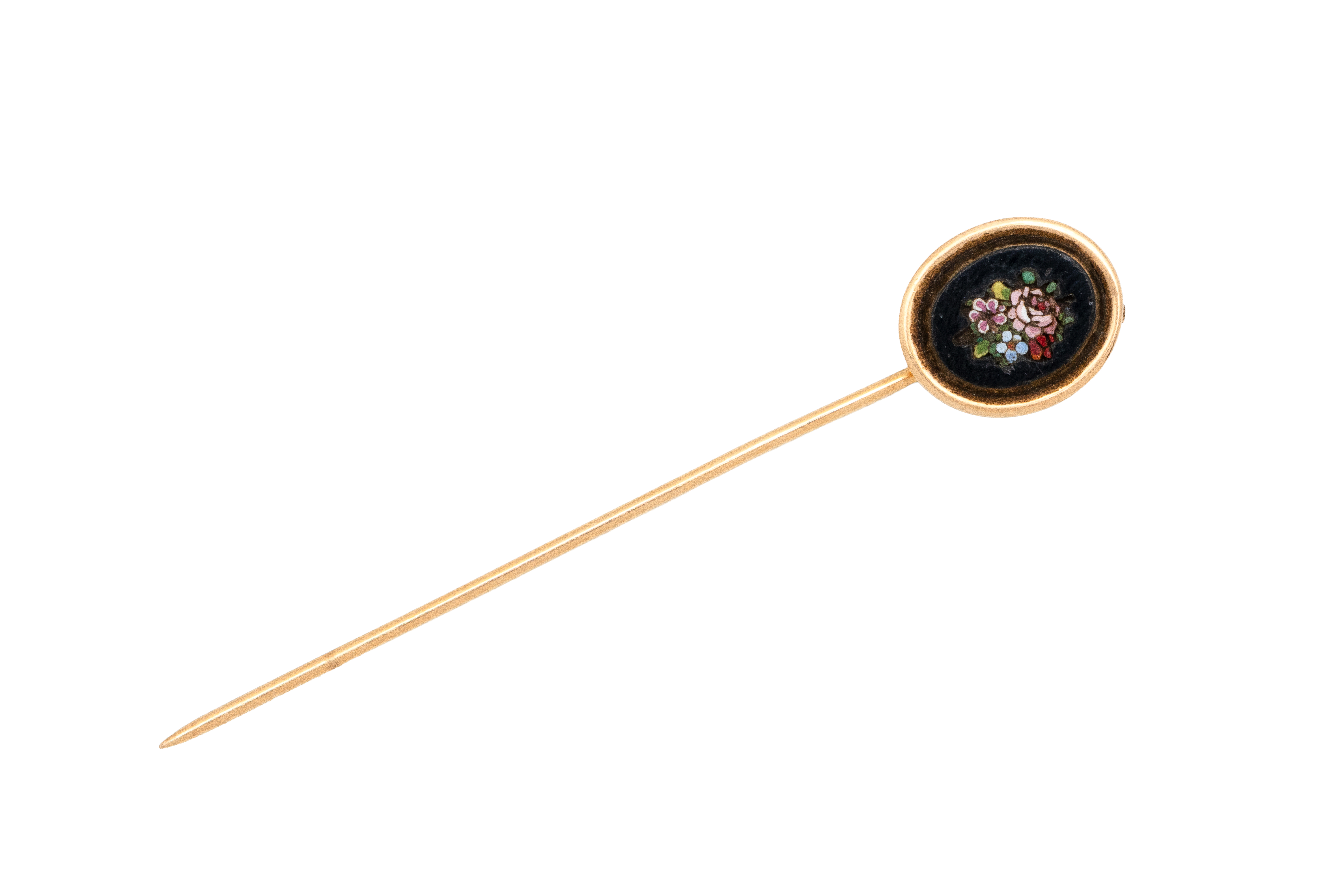 Lot n°228NV9140Épingle de cravate en or 750 millièmes ponctuée d'un diamant brillanté, accompagnée de sa chaînette et de sa sécurité. Vers 1900.( en l'état)